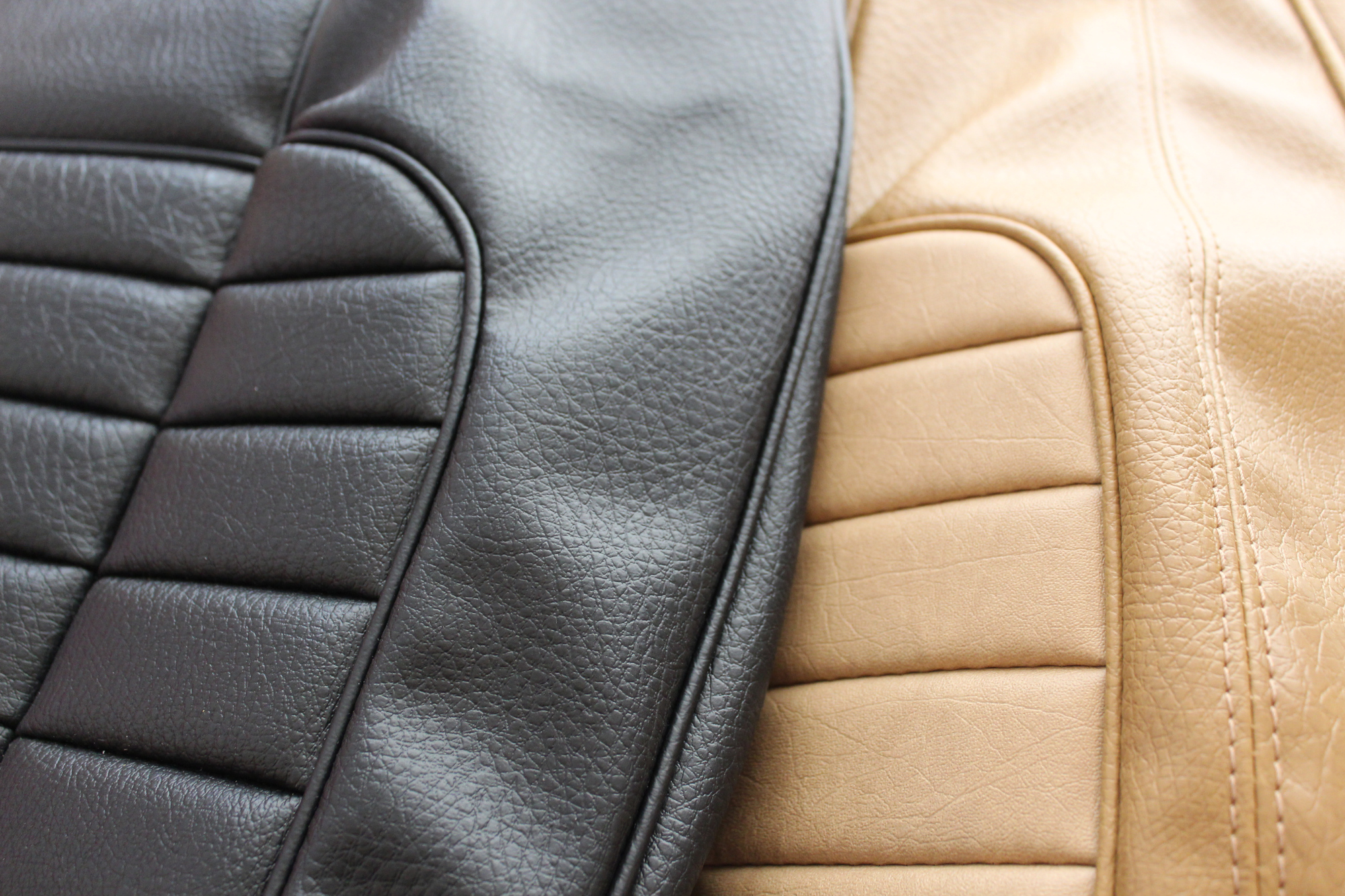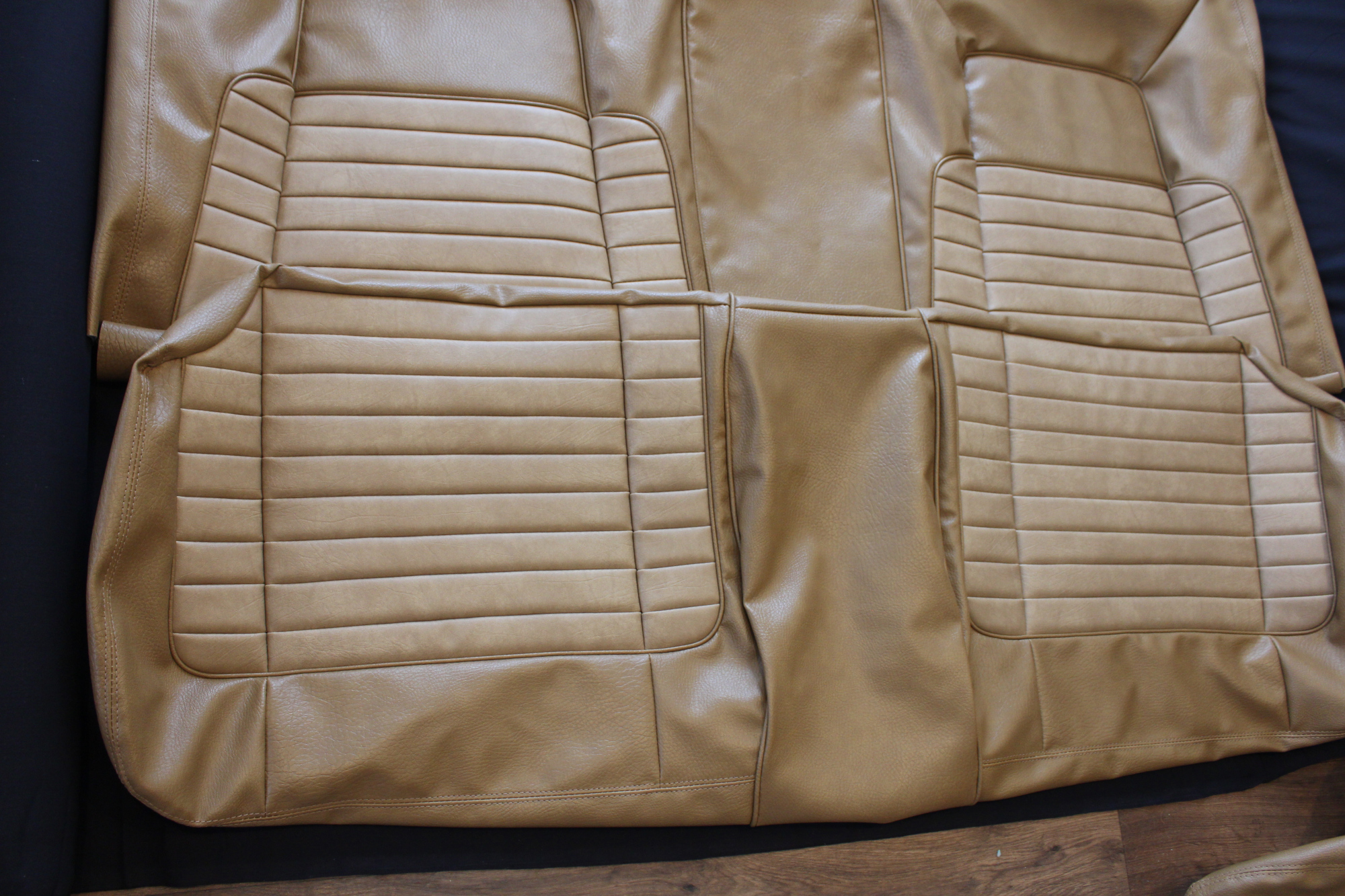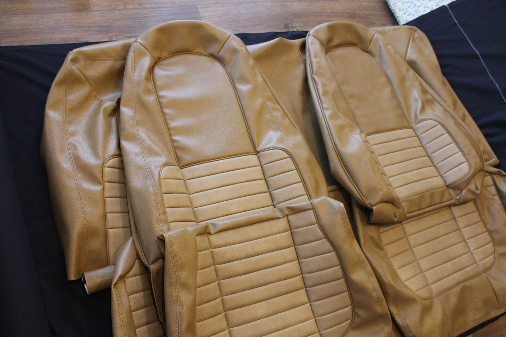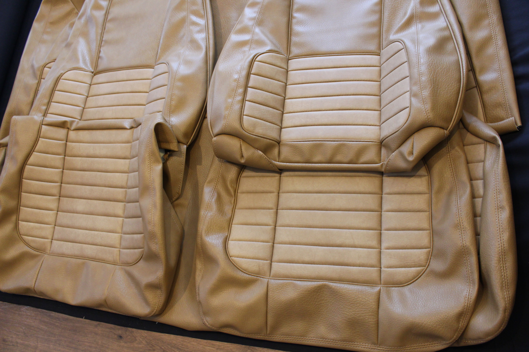 front & rear seat skins in black R/T or XL style vinyl, front & rear seat foam kit, extra vinyl for front seat backing boards and hand brake cover.