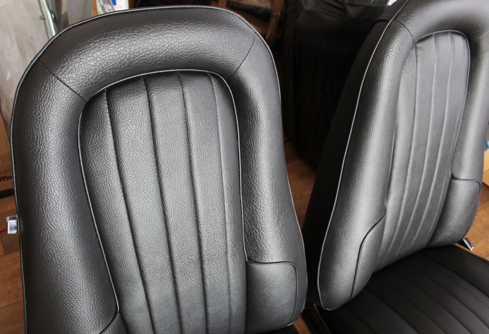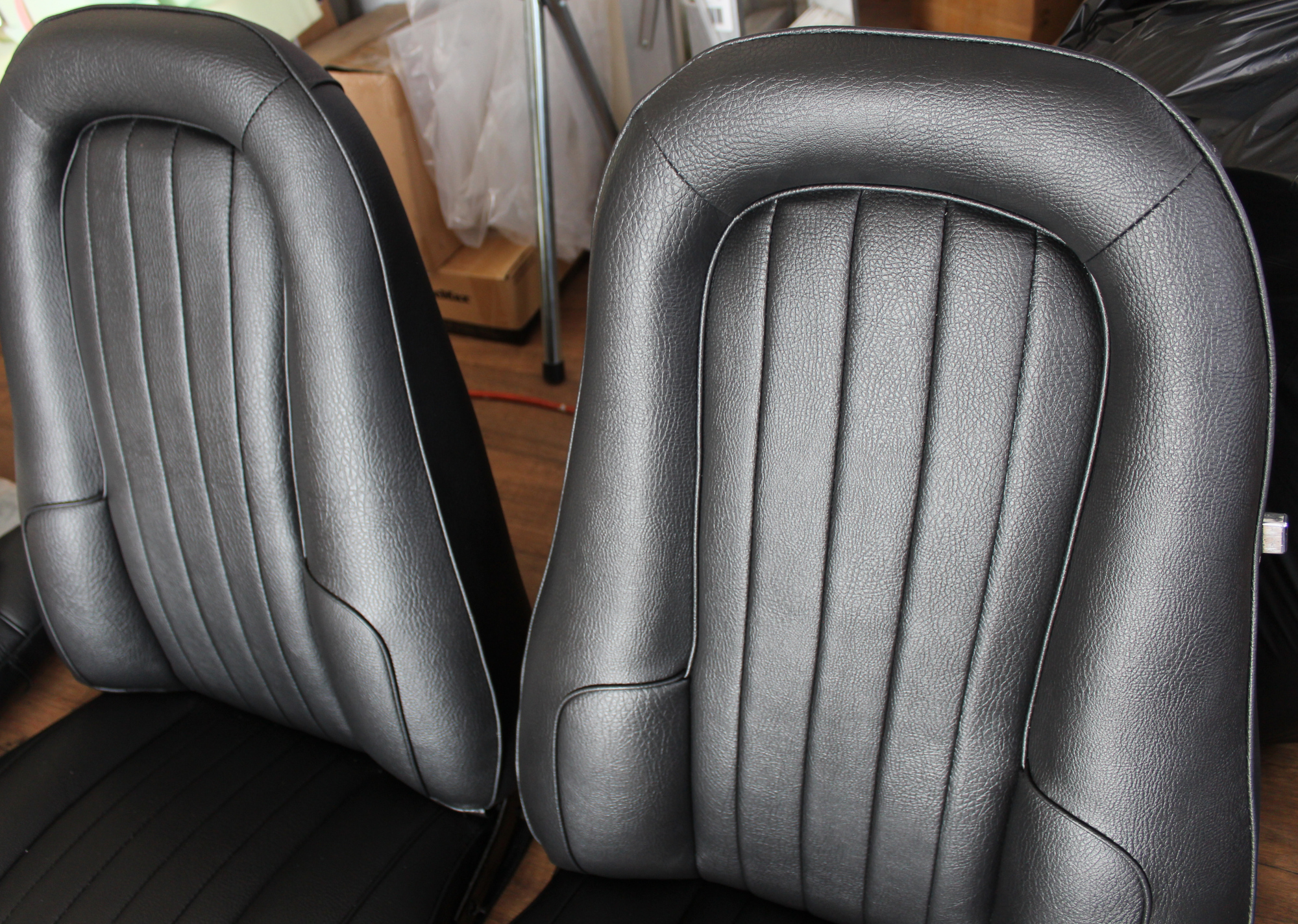 front only seat skins in black roebuck vinyl, front only seat foam kit, extra vinyl for front seat backing boards and hand brake cover.